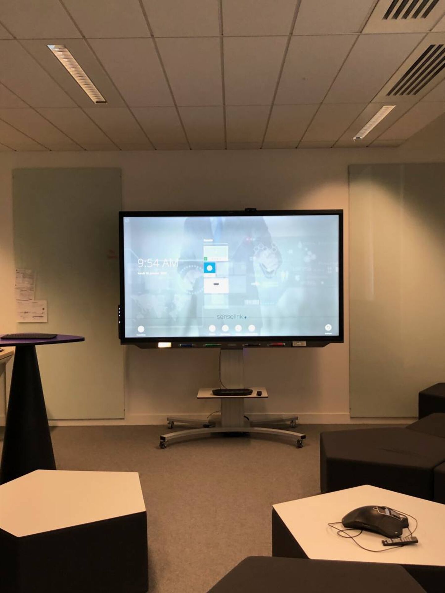Un écran Smart sur pied amovible et réglable en hauteur est un incontournable de l’open space. Vous pourrez le déplacer facilement dans l’espace en fonction de vos besoins de collaboration. En l’installant dans un coin de la pièce avec quelques fauteuils autour, vous pourrez vous réunir très facilement.